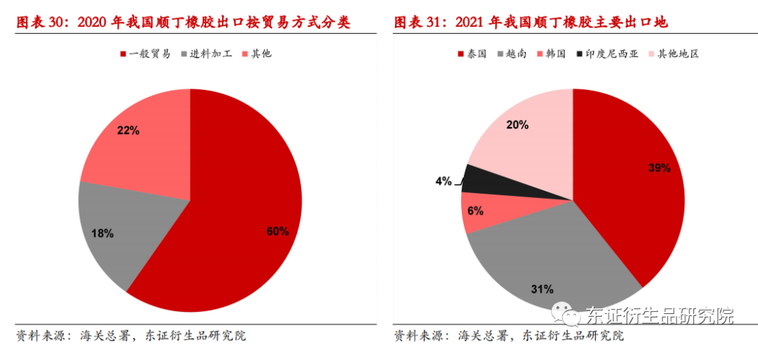 出口方面,2020年以前,我國順丁橡膠年度出口量未超過5萬噸。2020年我國順丁橡膠出口量較2019年大幅提升近51%,2021年出口量繼續大幅增長。近兩年順丁橡膠出口量顯著增長的原因主要有三點:1)2020年3月,財政部、税務總局聯合發佈公告,再次提高部分合成橡膠產品出口退税率,大部分合成橡膠產品可享受13%的出口退税率;2)2020年以來我國以加工貿易的形式自泰國進口原料丁二烯並向其出口順丁橡膠,顯著增加了出口量;3)國內輪胎企業加速產業的全球化佈局,尤其是東南亞地區的輪胎項目提振了國內順丁橡膠的出口量。從貿易方式看,我國順丁橡膠出口同樣以一般貿易和進料加工貿易為主。從出口目的地看,我國順丁橡膠出口量前三位的國家分別是泰國、越南和韓國。