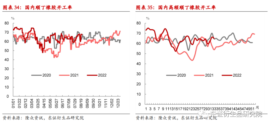 今年3月中下旬至4月中旬,順丁膠開工率一度大幅下滑。一方面是丁二烯價格持續走高導致順丁膠利潤明顯收窄,部分民營裝置降負運行,加上部分裝置停車檢修,供應收窄;另一方面是4月上旬時茂名裝置突發意外,開工率進一步下滑。4月中下旬順丁膠開工率開始探底回升,下半年以來行業開工率基本圍繞在65%附近波動,運行較為穩定。