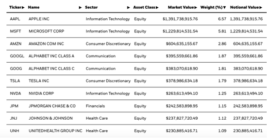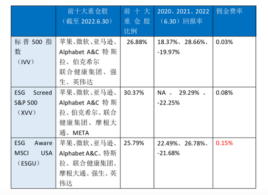 不以ESG指標為導向的核心標普500指數Core S&P500 (IVV)、ESG篩選的標普500指數(XVV)、ESG Aware MSCI USA (ESGU),這三隻基金中持股最多的均是蘋果、微軟、亞馬遜、Alphabet A&C和特斯拉;最大的行業敞口均是科技、醫療保健、金融服務和消費品。