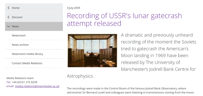 2009 年 7 月,英國曼徹斯特大學焦德雷爾班克天文臺公開發布了一份對1969年蘇聯無人駕駛飛船「月球 15 號」的跟蹤記錄,發現「月球15號」曾嘗試與「阿波羅11號」展開競爭,但最終墜毀。