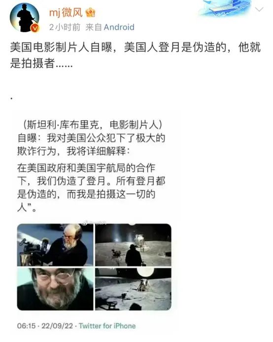 自9月初美國「阿爾忒彌斯1號」登月計劃再度被推迟以來,坊間對美國在上世紀將「阿波羅11號」載人飛船送上月球的質疑聲又多了起來。近日,一則聲稱「有電影製片人自曝偽造並參與拍攝了美國登月場景」的消息在中外社交平臺上流傳。