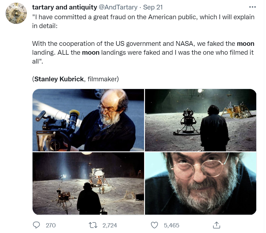 有關説法稱,美國製片人斯坦利·庫布里克承認對美國公眾進行了欺詐。他表示:「在美國政府和美國宇航局的合作下,我們偽造了登月。所有登月都是偽造的,而我是拍攝這一切的人。」