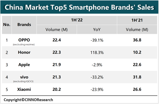 根據CINNO Research數據顯示,2022年上半年中國市場智能機銷量約1.34億部,同比下降16.9%,創下2015年以來最差的上半年銷量成績。主要原因是疫情反覆,上游芯片等核心零部件緊缺,以及居民消費預期降低等。