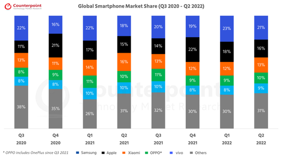 全球市場方面,根據Counterpoint的調查顯示,2022年上半年全球累計銷售手機6.21億台,同比下降8.4%,其中2季度全球手機銷量2.945億台,同比下降9%,為2020年二季度(當時因為全球心冠疫情爆發)以來第一次單季度銷量跌破3億台,2022Q2市場份額前五的分別是三星出貨6250萬台(市場佔比21%,下同)、蘋果出貨4650萬台(佔比16%)、小米出貨3950萬台(13%)、OPPO出貨2820台(10%)、vivo出貨2550萬台(9%),TOP5合計市場份額69%,基本維持70%左右的集中度。