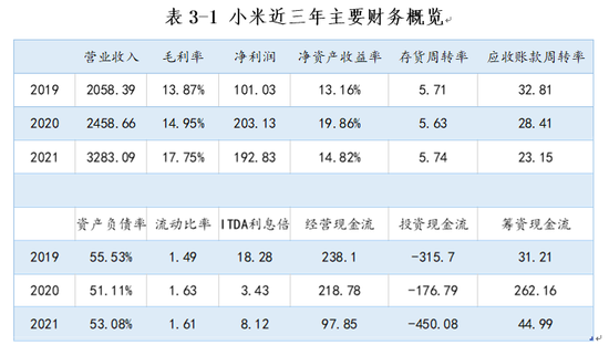 負債結構和償債能力方面,小米近三年的資產負債率比較穩定,分別是55.53%(總資產1836億元)、51.11%(總資產2536億元)、53.08%(總資產2928.92億元),同時償債能力也相對穩健,近三年的流動比率分別是1.49、1.63、1.61,近三年EBITDA利息倍數分別是18.28、3.43、8.12。