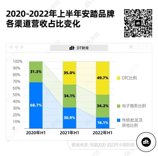 從財報數據和集團口徑解釋來看,安踏品牌的營收增長,主要是因為這兩年進行的DTC銷售模式變革取得成效。2022上半年,安踏品牌營收中DTC渠道的佔比已經接近一半。