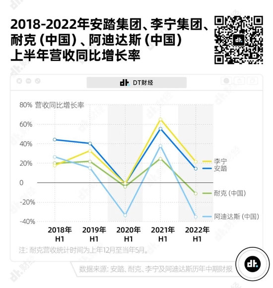 來到2022上半年,疫情反覆,耐克中國營收同比下滑11%,阿迪達斯中國同比下滑35%,安踏(13.8%)和李寧(21.7%)雖然不如去年那麼迅猛,但仍保持正向高速增長。