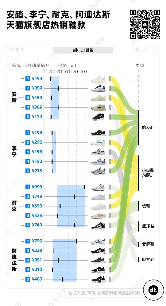 DT財經簡單統計了幾大運動品牌官方旗艦店的熱門鞋款,可以看到,國產品牌的熱銷產品價格明顯更加親民,在類型上,國產品牌熱銷主要集中在跑鞋和板鞋,而耐克最熱銷的是籃球鞋。