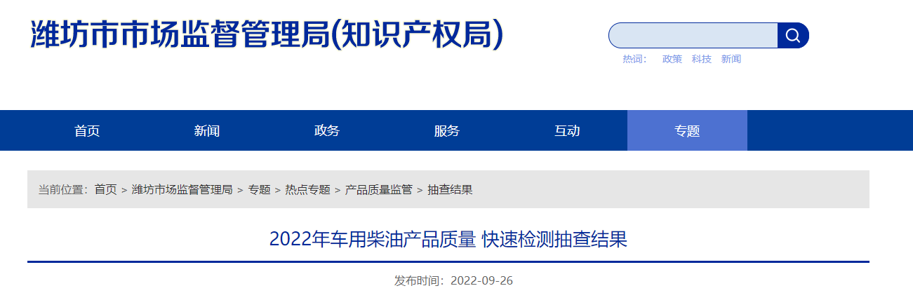 中國質量新聞網訊 2022年9月26日,山東省濰坊市市場監督管理局網站公佈2022年車用柴油產品質量快速檢測抽查結果。