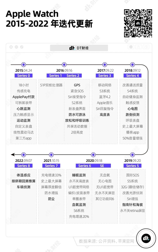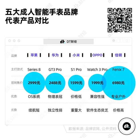 目前銷量最高的五個智能手錶品牌,都下屬有不同的產品線,針對不同人羣的需求。以蘋果為例,今年九月發佈的新款Apple Watch,就有SE(性價比款)、S8(全能標配)、Ultra(户外專業)三個系列。