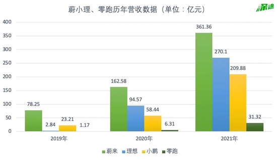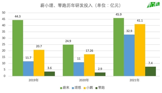 零跑2019年、2020年的研發開支是3.6億元、2.9億元,最高的2021年,達到了7.4億元。但理想、小鵬同期分別豪擲33億元、41億元。按照此次8億美元的融資金額計算,接下來將有3.2億元美金(23億元人民幣)投入研發,這些研發投入超過過去3年總和,但相比蔚小理來説,還差得遠。