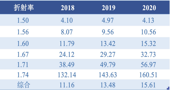 2018-2020年明月鏡片各折射率鏡片平均銷售單價,單位:元/片