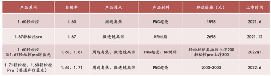 此外,明月鏡片離焦鏡的產品線較豐富,2022年6月追加4款新品后,目前已具備8款離焦鏡產品。其中,「輕松控」鏡片採用了周邊離焦眼軸控制技術,「輕松控pro」則使用多點近視離焦眼軸控制技術,並具有1.60/1.67/1.71三種不同折射率及防藍光功能。