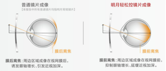 近幾年,市面上出現一種青少年近視防控「神器」——離焦鏡,與傳統框架眼鏡最大的不同在於離焦鏡可以減緩青少年近視。離焦鏡主要通過鏡片度數的特殊設計,使周邊區域成像於視網膜前,從而抑制眼軸增長,延緩近視加深。去年,明月鏡片已經推出輕松控和輕松控Pro兩大類離焦鏡產品。