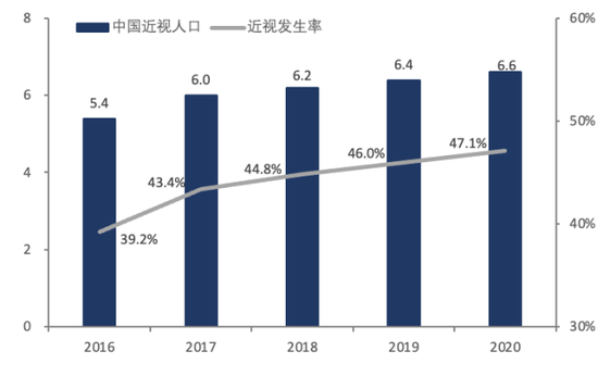 2016-2020年中國近視人口及近視發生率,單位:億