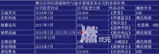 以騰訊視頻為例,據燃次元不完全統計,截至今年上半年,騰訊總共投資了7家與科幻動畫相關的公司,包括《靈籠》背后的藝畫開天、《吞噬星空》背后的玄機科技、《雄兵連》背后的駿豪宏風,以及《星骸騎士》背后的黑巖網絡等。而騰訊對這些公司的投資時間,集中在2017年至今的5年里。