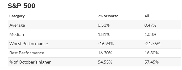 歷史數據顯示,10月美股有望迎來企穩回升,特別是在經歷了大幅殺跌后的情況下。道瓊斯市場數據統計發現,自標普指數創立以來,9月下跌了7%或以上的情況共11次,接下來的10月指數平均上漲0.53%,中位數上漲1.81%。