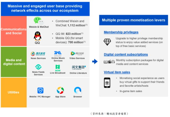 先分析企業的基本業務,按月活躍賬户數計算,騰訊的社交通信平臺微信及QQ是中國最大的網上社交平臺,微信及WeChat的合併月活躍賬户數約12億,簡單來説,絕大部分中國人都用,即是完全壟斷。