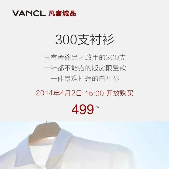 2014年,凡客推出一款單品:「300支襯衫」。服裝發佈會不講設計,大講參數,宛如手機發佈會。陳年侃侃而來:300支指的是面料用新疆長絨棉,一英寸布料有300根紗線;襯衫鈕釦的材料是所羅門羣島的海水貝殼。一件襯衫售價499,一整個華貴住了。