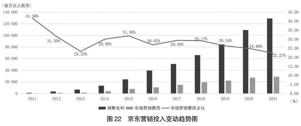 京東的營銷投入22.27%(見圖22),研發投入12%,它更是營銷驅動型。