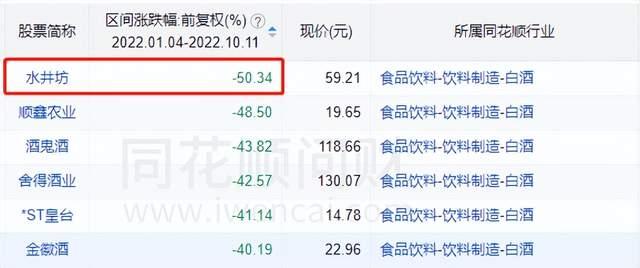 截至10月11日午間收盤,在白酒股跌幅榜上,跌超30%的有9家,跌超50%的有1家。其中,水井坊的跌幅是50.34%,略高於順鑫農業的48.50%,領跌白酒行業。