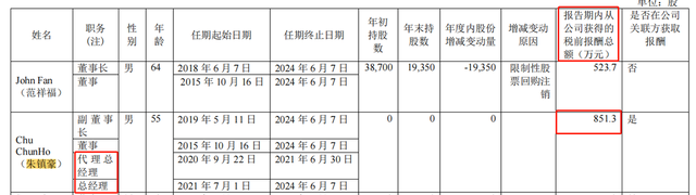 2021年報中,朱鎮豪的職務是副董事長、董事、代理總經理和總經理,年薪變成了851.3萬元。