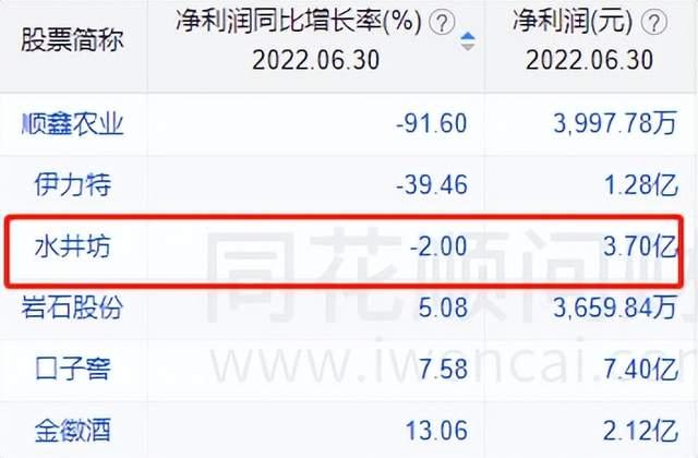 同花順顯示,20只白酒股中報淨利潤下滑的有3家,水井坊就是其一。