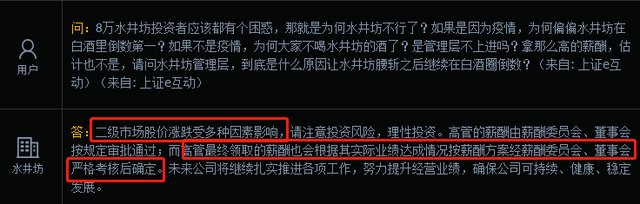 股價腰斬,股民找管理層要説法。在互動平臺,有股民表示:「貴公司股票連續下跌,領跌酒類板塊指數,公司高管薪酬位於行業居首,管理層是否只顧自身利益,不顧投資者利益?」