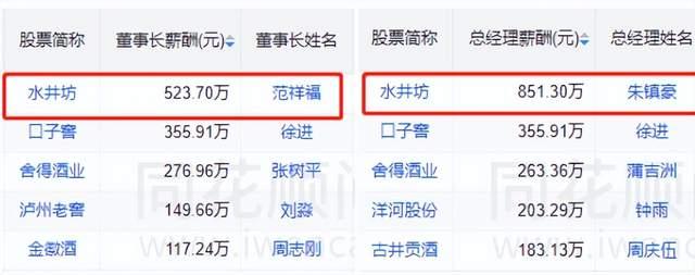 同花順顯示,水井坊董事長是範祥福,薪酬523.7萬元,總經理是朱鎮豪,薪酬是851.3萬元,二人薪酬均排在白酒板塊第一名,且遠遠高於第二名。