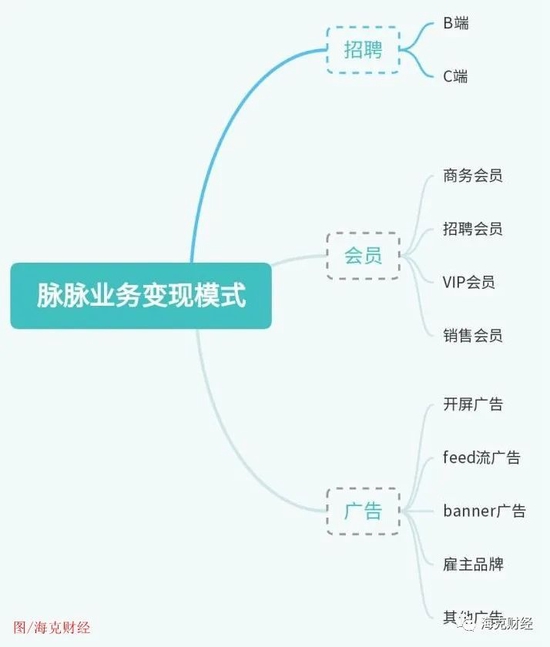 一位脈脈前員工對海克財經表示,上線於2013年10月的脈脈,前5年的變現方式只有廣告與會員,廣告類型主要是開屏廣告、feed流、banner位、僱主品牌廣告等;最初脈脈並未將招聘作為一項獨立業務來推,而是將其歸到了廣告業務里,彼時招聘主要是職位推薦,該項收入在廣告總收入中佔比不足20%。