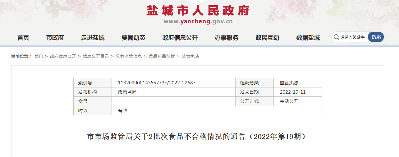 中國質量新聞網訊 近日,江蘇省鹽城市市場監督管理局發佈關於2批次食品不合格情況的通告(2022年第19期)。通告稱,近期,該局完成2022年9月食品抽檢任務100批次,涉及肉製品、水果製品、糕點、薯類和膨化食品、酒類、餅乾、食用農產品、糖果製品、乳製品、飲料等食品。根據食品安全國家標準檢驗和判定,其中抽樣檢驗項目合格樣品98批次、不合格樣品2批次,具體情況如下: