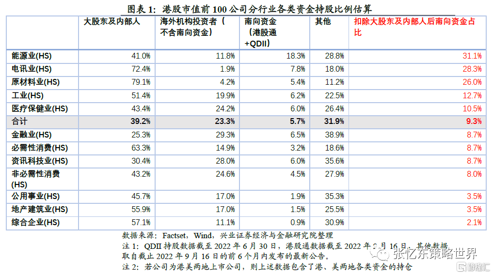 2、我們估算了港股恆生綜指成份中市值前100的公司各類資金的持股佔比,數據來源包括國內及海外公開披露的基金、保險等資產管理機構的持倉報告、上市公司公告以及滬深港通的數據。