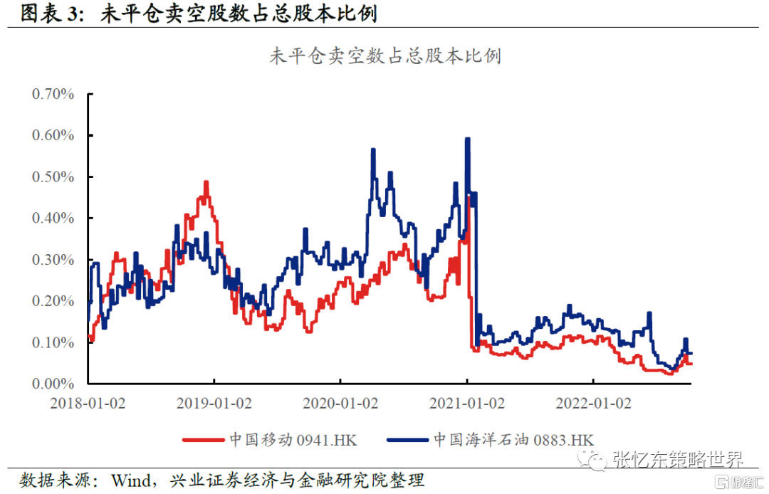 6、 美資或美資相關機構不能交易所謂「涉軍企業名單」內的港股受外資影響相對更小。美東時間2020年11月12日,美國總統特朗普在白宮官網發佈《關於應對與「中方涉軍企業」相關的證券投資威脅的行政命令》,禁止美國主體投資「中方涉軍企業」。以中國移動、中國海洋石油為例:南向持倉佔扣除大股東及內部人后的自由流通股本比例分別達到31.68%、48.12%;相關股票的賣空交易在投資禁令實施后也急劇下降(詳見圖表3)。