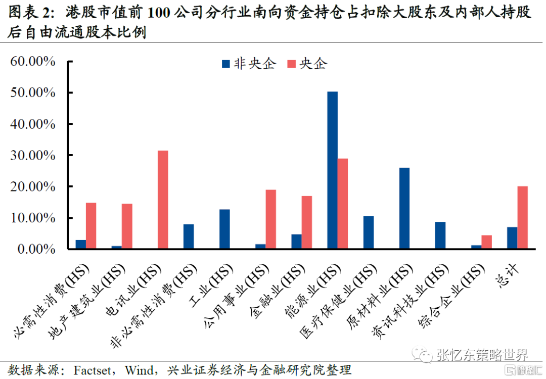 5、 按企業性質劃分,央企受外資影響相對更小(詳見圖表2)。南向資金持倉佔扣除大股東及內部人持股后自由流通股本比例,港股市值前100公司中央企這一數值為20.1%,而非央企僅為7%。