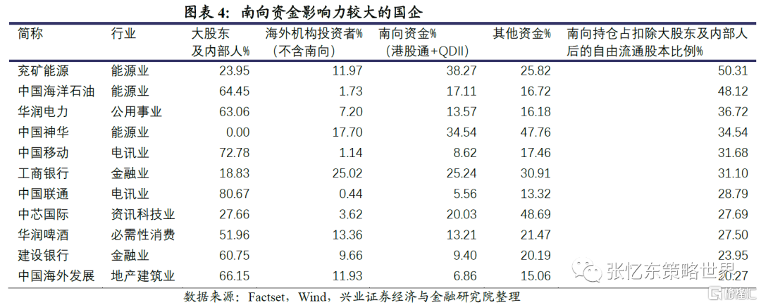 7、行業內部個股之間也有較大差別。我們統計了港股市值前100公司,以南向持倉佔扣除大股東及內部人后的自由流通股本比例>20%為標準,篩選出各行業南向資金相對海外機構投資者影響力更強的國企(詳見圖表4):能源業(兗礦能源、中國海洋石油、中國神華)、公用事業(華潤電力)、電訊業(中國移動、中國聯通)、非必須消費(華潤啤酒)、地產建築(中國海外發展)、金融業(工商銀行、建設銀行)、資訊科技業(中芯國際)。