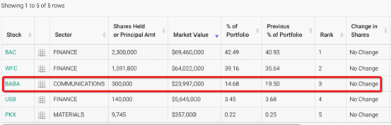 最引人注意的是,中國互聯網龍頭阿里巴巴位列第三大重倉股,持倉約30萬股,持倉市值2399.7萬美元,約合人民幣1.72億元,佔總持倉比為14.68%。