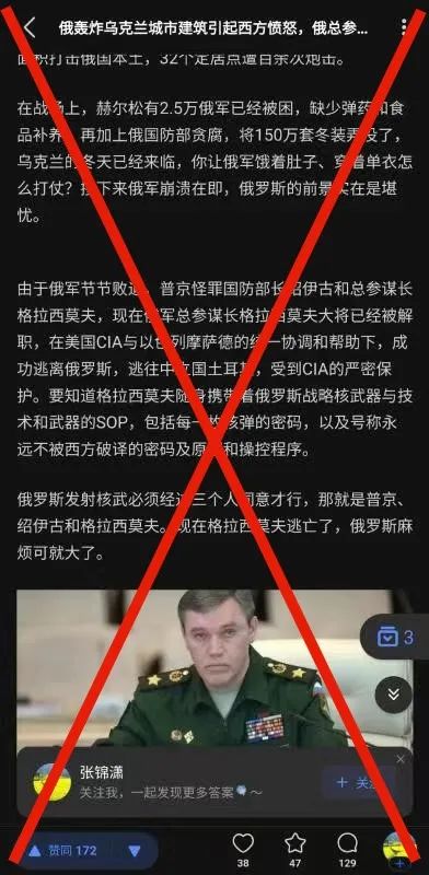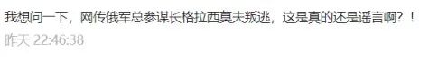 有知乎網友在10月12日發佈長文稱「現在俄軍總參謀長格拉西莫夫大將已經被解職,在美國CIA與以色列摩薩德的統一協調和幫助下,成功逃離俄羅斯,逃往中立國土耳其」「格拉西莫夫隨身攜帶着俄羅斯戰略核武器與技術和武器的SOP,包括每一枚核彈的密碼,以及號稱永遠不被西方破譯的密碼及原理和操控程序」。