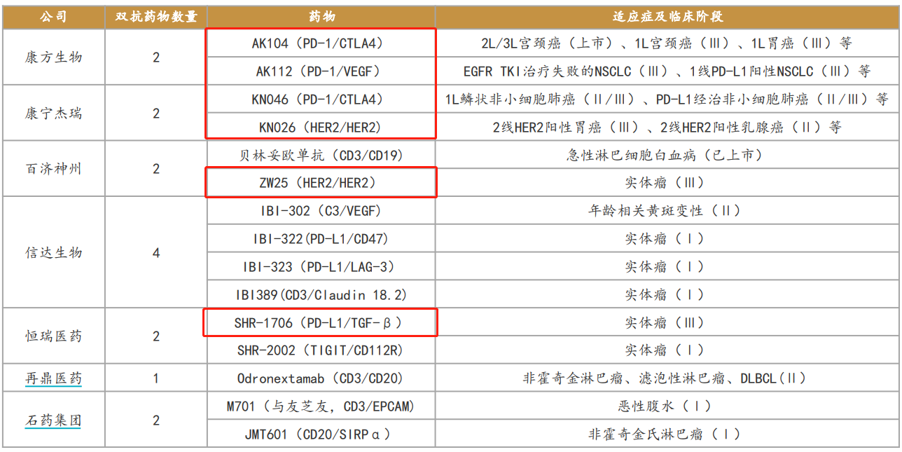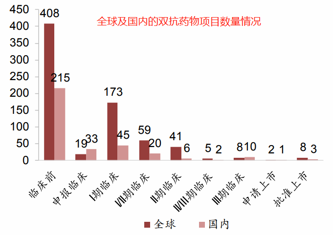 從全球和國內雙抗藥物研發進度來看,大多數還處於早期階段,進入到二期、三期和NDA的藥物相對較少,部門藥物已具備較為明顯的先發優勢。值得一提的是,我國藥企在雙抗領域研發投入力度在全球都是領先的,臨牀數量甚至可以和全球總和放在一起比較。