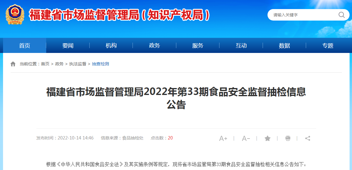 | SC22350000360211037 | 120 | 福建省新麥食品有限公司 | 福建省漳州市龍文區福岐北路18、20號 | 永輝超市股份有限公司福建福州井樓門超市 | 福建 | 奶酪吐司軟麪包 | 散裝稱重 | 2022/7/24 | 糕點 | 第33期 | 2022.10.14 | 福建/省抽 | |