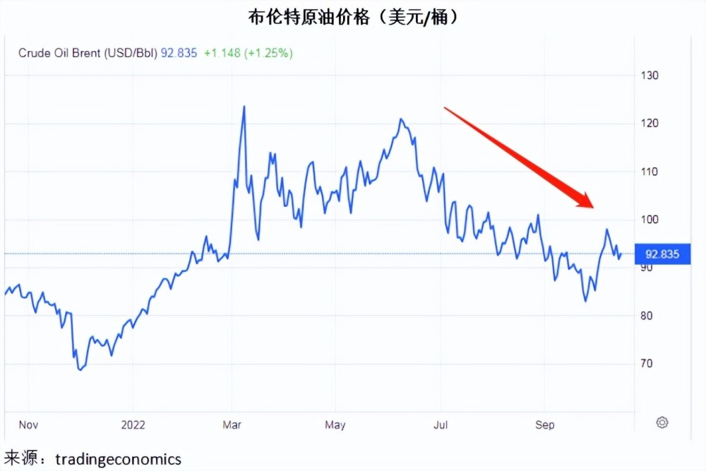 見下圖,年初至今,布倫特原油價格累計上漲15.70%。但需要注意的是,上半年原油累計漲幅曾達到31.88%,但到下半年,由於全球經濟放緩,加上歐美國家能源通脹高企,石油消費需求有所緩和,油價開始回落,但最近在OPEC+宣佈從11月起每日減產破紀錄的200萬桶后,油價稍微回升,重上92美元水平。