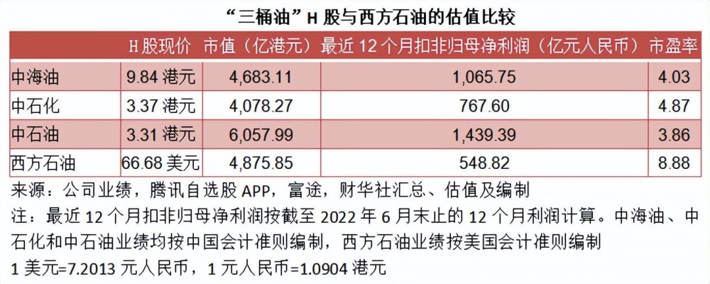 雖然盈利能力佔優,中海油的H股估值卻低於同行。見下表,其市盈率估值只有4.03倍,遠低於中石化的4.87倍以及西方石油的8.88倍,與規模型同行中石油相若。