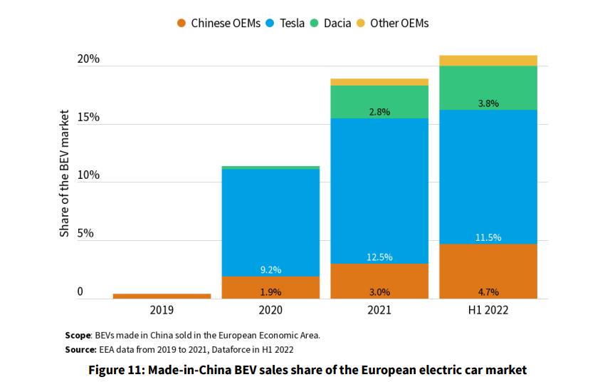 如果將一些在中國生產的非中國品牌電動車計算在內,那麼2022年上半年中國生產的電動車佔到歐洲電動市場份額的21%。