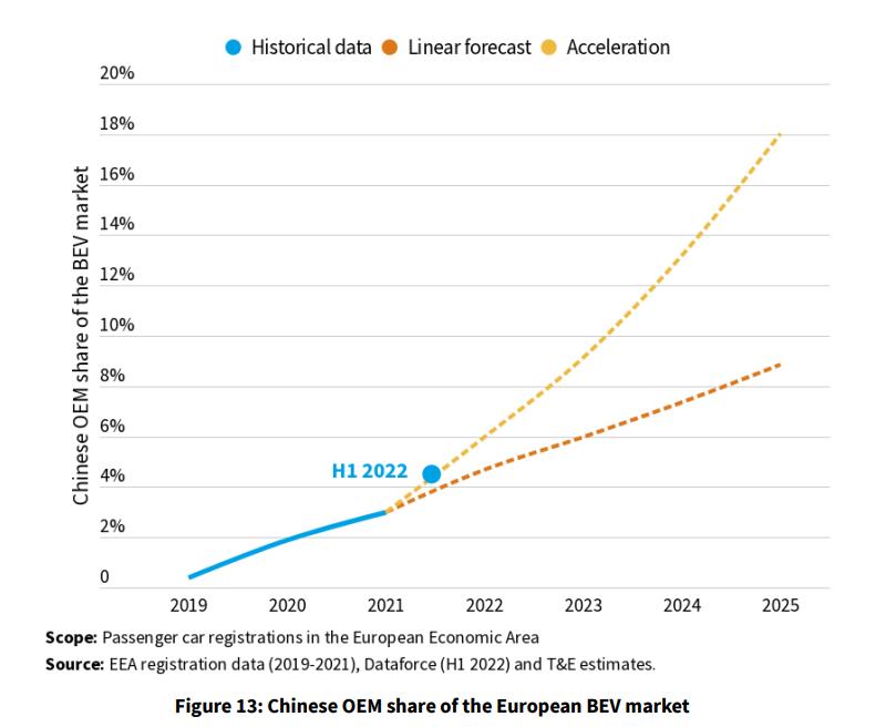 T&E進行了一番預測,根據2019-2021年的歷史趨勢,假設2022年全年中國電動車在歐洲的份額與上半年相似(約5%),則可以預期,到2025年,中國汽車製造商可能達到歐洲電動車市場至少9%的份額。而如果2022年它們能夠實現6%的份額,那麼增速曲線將發生變化,到2025年份額或將達到18%。