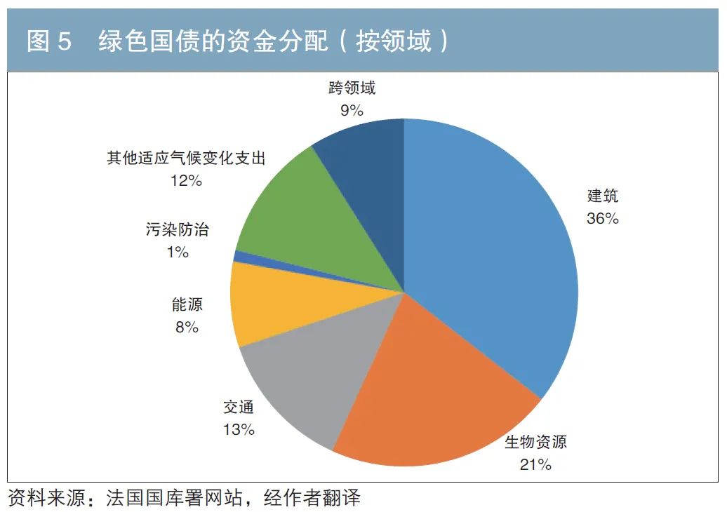 截至2020年底,法國首隻綠色國債的資金大部分用於減緩氣候變化(見圖4)。從領域來看,主要用於建築業、生物資源領域(見圖5)。
