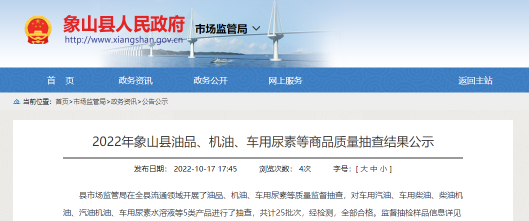 中國質量新聞網訊 據浙江省象山縣人民政府網站2022年10月17日發佈的《2022年象山縣油品、機油、車用尿素等商品質量抽查結果公示》,象山縣市場監管局在全縣流通領域開展了油品、機油、車用尿素等質量監督抽查,對車用汽油、車用柴油、柴油機油、汽油機油、車用尿素水溶液等5類產品進行了抽查,共計25批次,經檢測,全部合格。