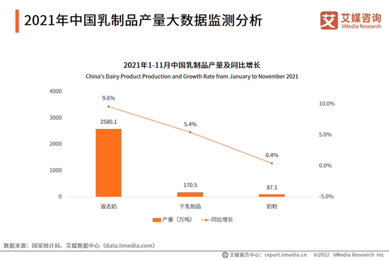 艾媒諮詢數據顯示,2021年1-11月,中國液態奶產量為2580.1萬噸,同比僅增長9.6%。