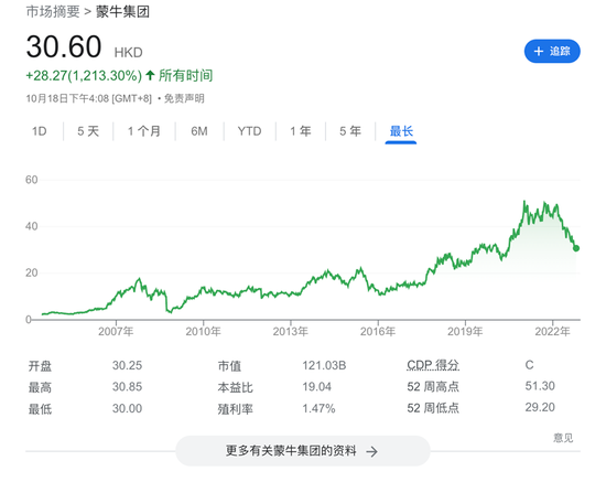 巧合的是,蒙牛的股價也與妙可藍多有類似的下跌趨勢。截止2022年10月18日收盤,蒙牛的股價為30.60港元/股,相較於年初50港元/股左右的高點下跌了40% 左右。