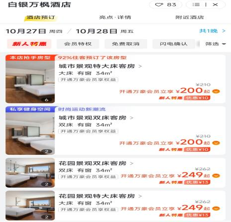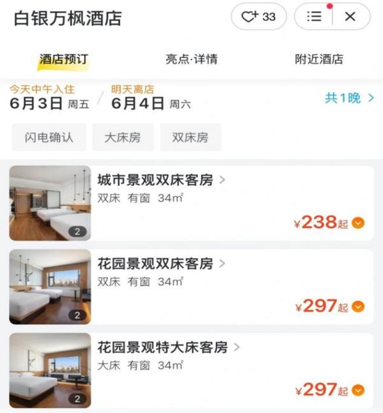 潘哥發現,今年6月初,白銀萬楓酒店的價格,城市景觀雙牀客房,一晚238元起,如今售價200元,不到半年降了38元;而花園景觀雙牀客房297元起,如今為249元一晚,已經降了48元。
