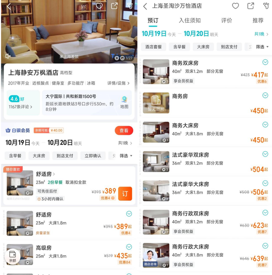 在去哪兒App上,潘哥看到上海靜安萬楓酒店,23平米的舒適大牀房,含2份早餐的話,一晚僅為389元;而在上海聖淘沙萬怡酒店,40平米的商務雙牀房,不含餐的價格,一晚僅售417元。