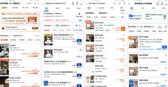 在曲阜魯能JW萬豪酒店,潘哥發現同日期同房型的酒店價格,在飛豬、美團、去哪兒、攜程上,分別為541元、570元、566元和569元。